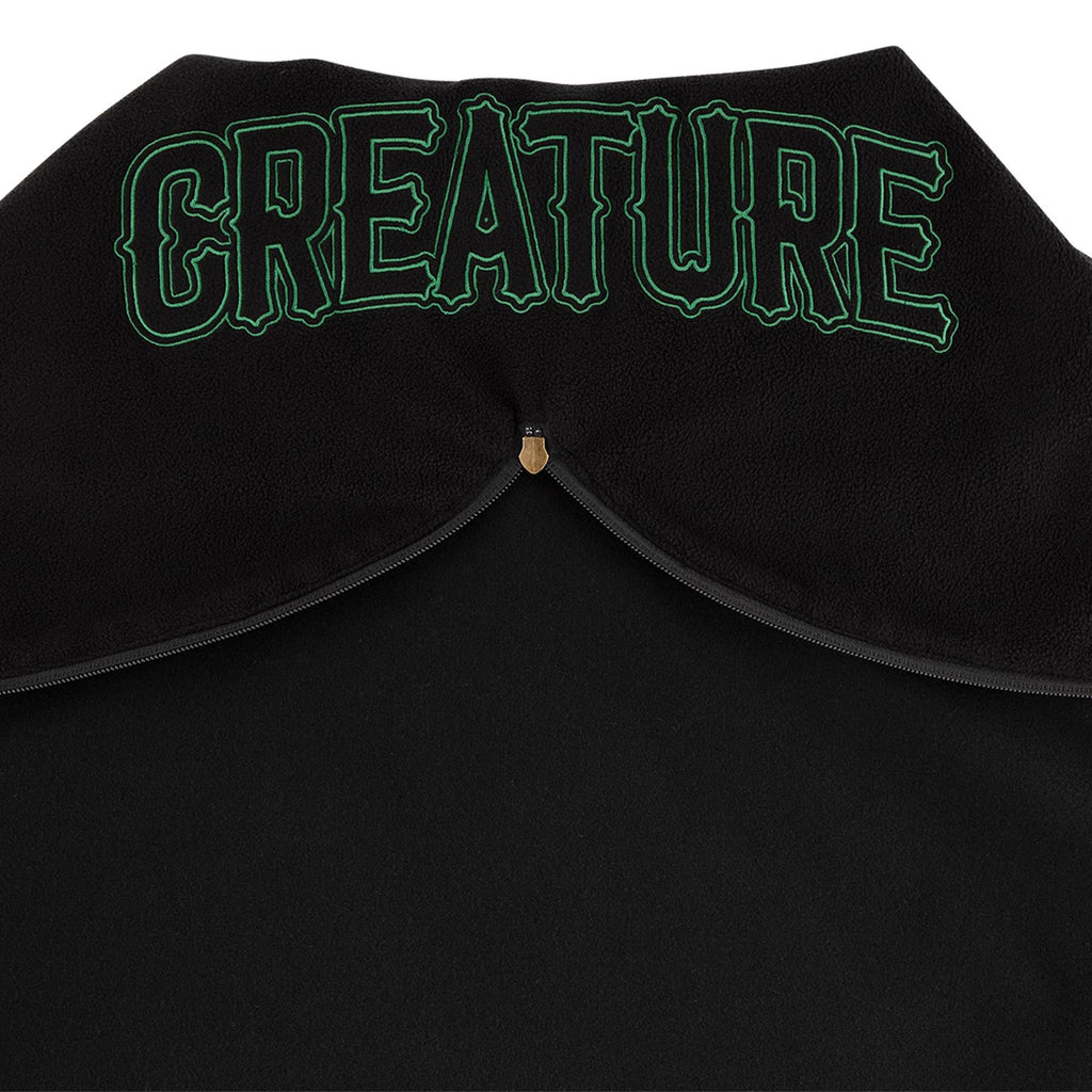 The Creature Drop Out men’s custom regular fit varsity jacket features polar fleece and taffeta sleeve linings, zip split hood with direct embroidery, direct embroidery at right chest, felt applique at left chest, faux leather welt hand pockets, interior elasticated patch pocket with woven label, flat drawcords and matte black hardware.