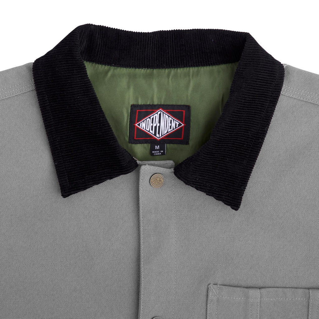 Ride the best in the latest jackets and apparel from Independent Trucks. The new Independent Springer regular fit heavyweight duck canvas chore coat jacket features contrast lining and screen print, custom Independent brass shank buttons, patch pockets, corduroy collar and woven logo label at chest pocket. Independent Trucks - Built to Grind.